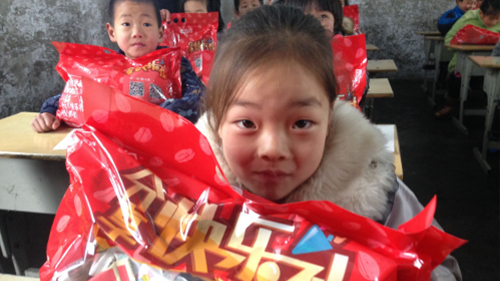 尽管当地刚下完暴雪,天气异常寒冷,但是准时到达的年货却让学校里充满了笑声和温暖。志愿者们每发一份年货,孩子们都说一声“谢谢”,看着孩子们脸上的笑容,所有的工作都是值得的。