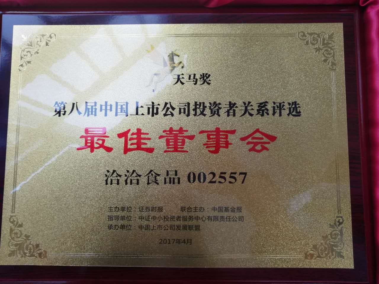 4月27日下午,由证券时报、中国基金报联合主办,中国上市公司发展联盟承办的“天马奖•第八届中国上市公司投资者关系评选”颁奖典礼在贵阳完美收官。乐鱼体育app(002557)荣获“中国上市公司投资者关系最佳董事会”。
