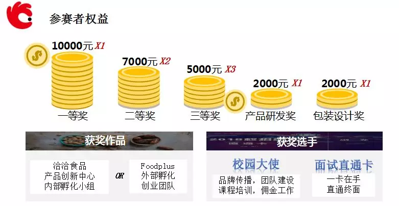 最终大赛将角逐出一、二、三等奖分别获10000元、7000元、5000元奖金;产品研发奖、包装设计奖分获2000元奖金。除丰厚奖金外,本届获奖创意将有机会由乐鱼体育及FoodPlus孵化团队进行孵化落地,获奖选手还将成为乐鱼体育校园大使,获得面试直通卡,先人一步直达终面!